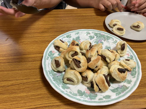 パイ生地をつぶして広げ、その上に板チョコのかけらを乗せ、くるくるっと巻いていきます。