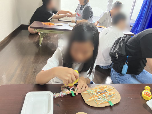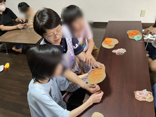 カボチャの形に切った段ボールにオレンジの毛糸を巻き付けていきます。
