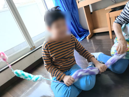 毛糸って、魅力的な素材。柔らかくって引っ張ったりつぶしたり。感触を楽しむだけでも楽しい。