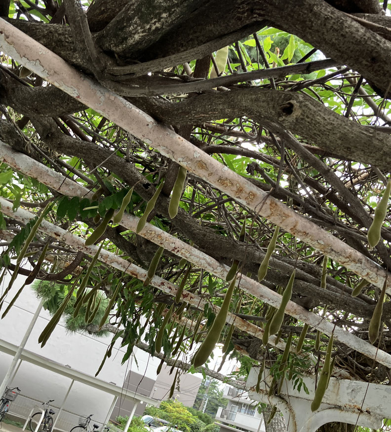 そして、その公園の藤棚にそら豆のような実がなっていました。